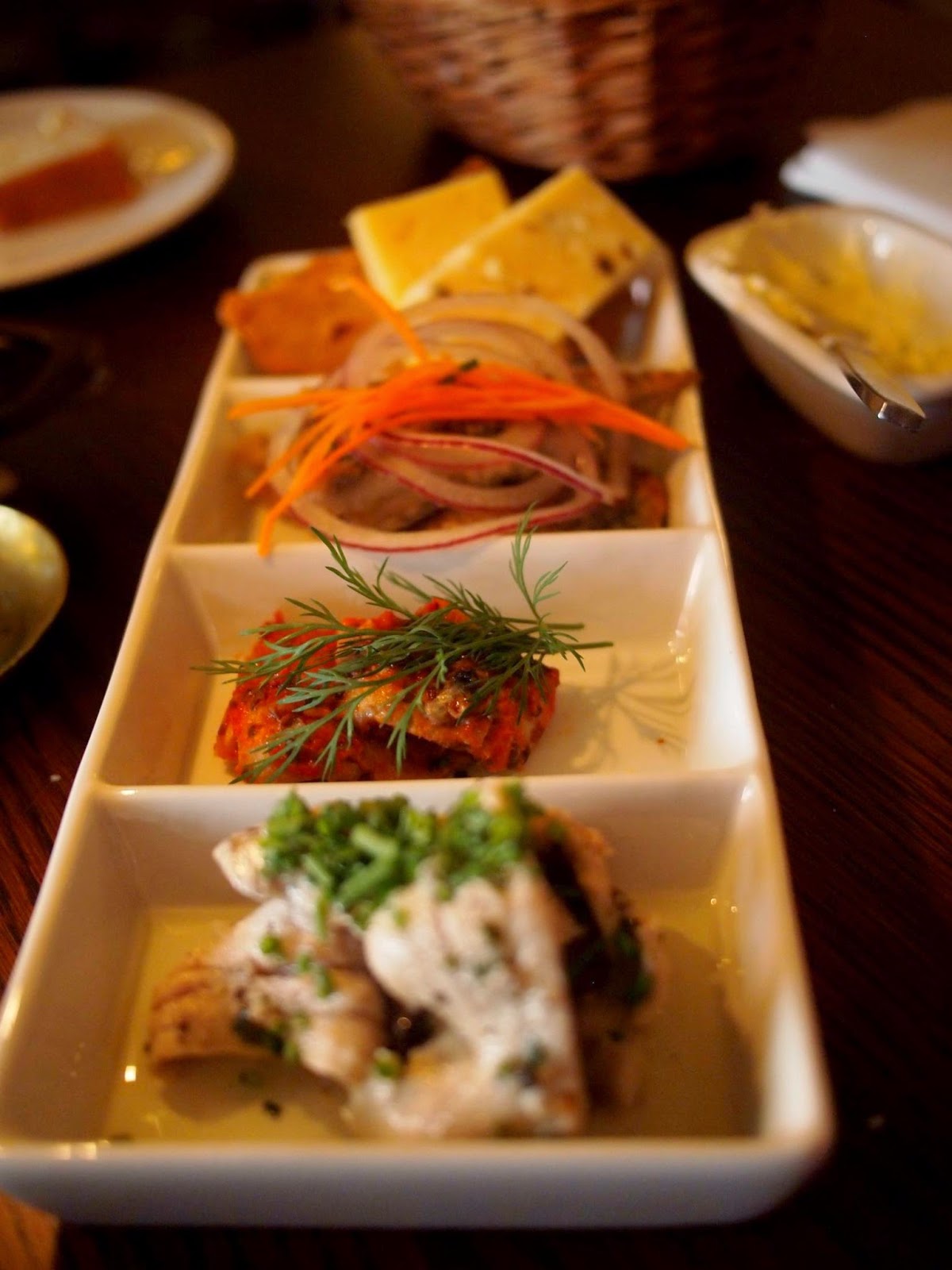 And finally, a selection of Herrings. Also with potato- this time boiled, which seemed like a waste when we knew the magic they could do with an over or even a masher. From front to back, a rather lemony delight (delicious!), something of a more cooked manner with tomatoes and other flavourings (also very tasty), and some horrible little beast pickled in sugar-water (just like they do in Deutschland), which I kindly left for Andy and Simon. Oh, and cheese.