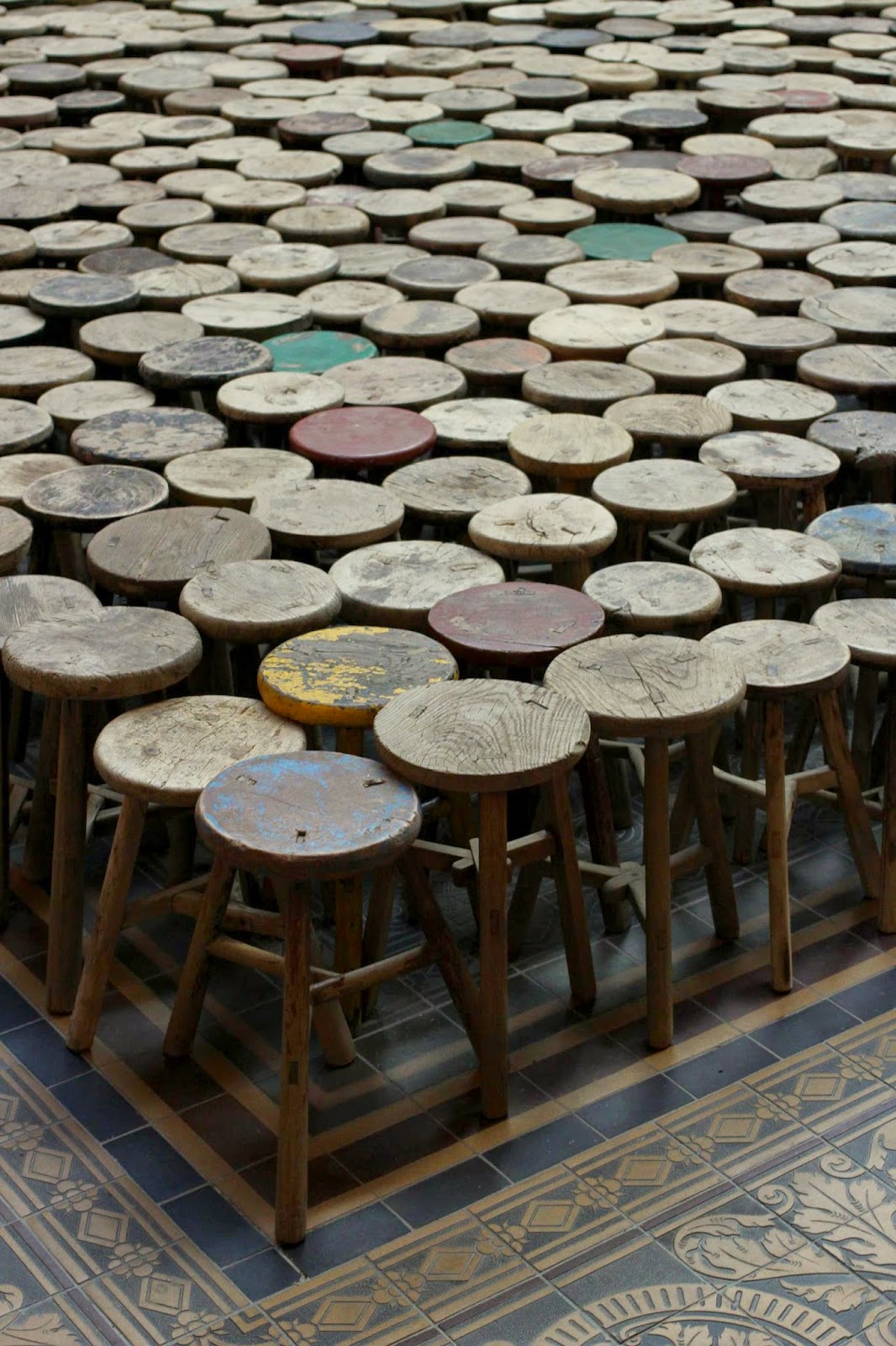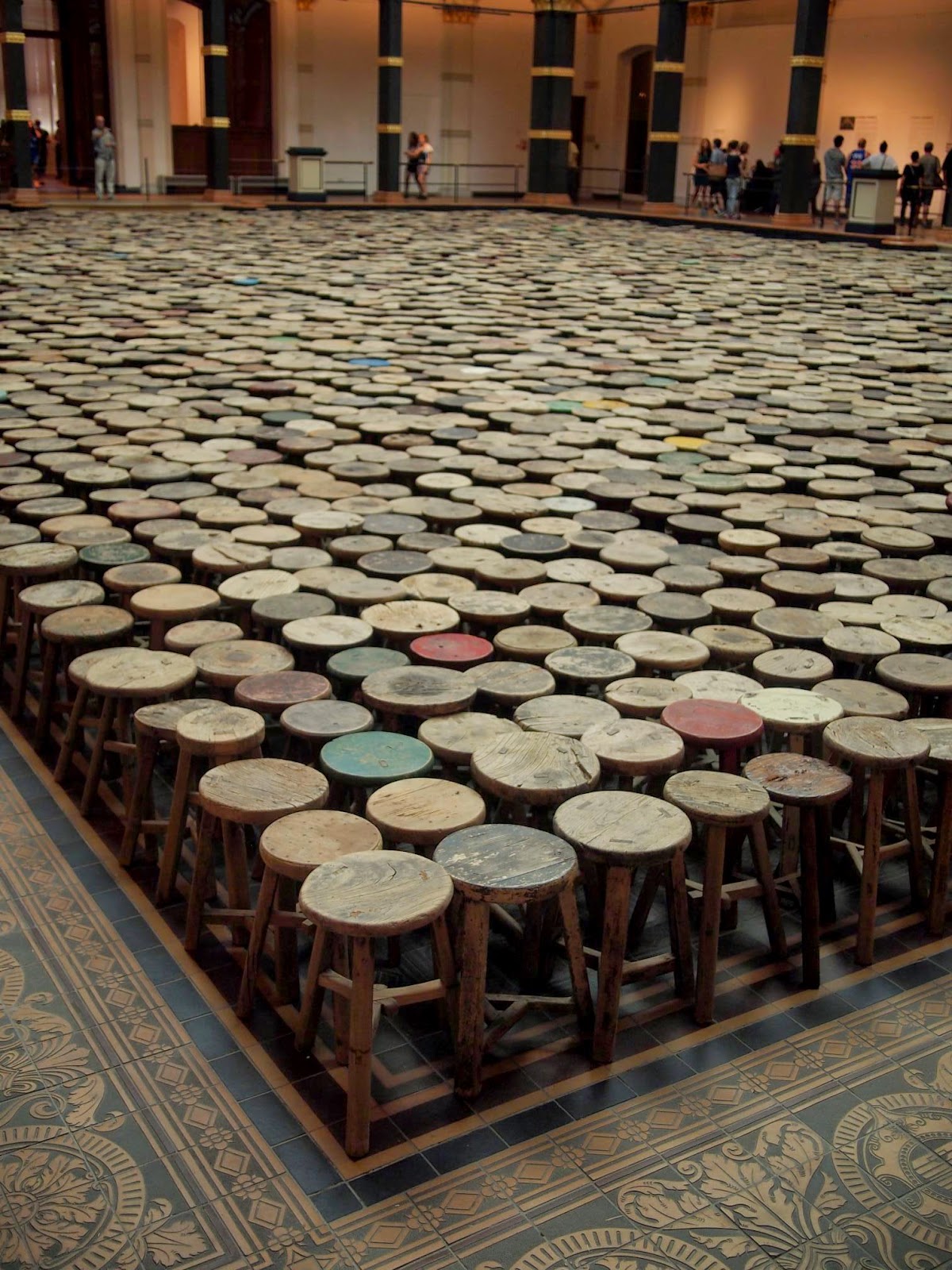 On walking into the exhibition, you’re confronted with a large hall filled with stools.