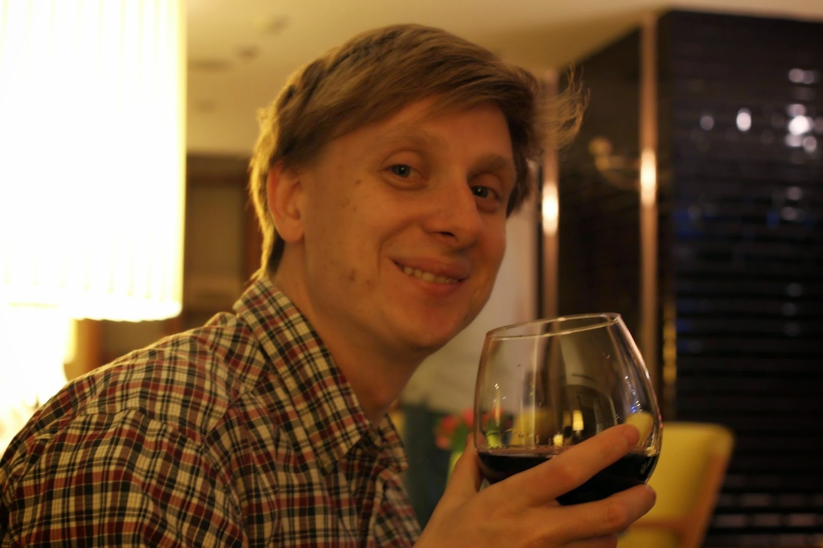… half a bottle of red wine in a man-sized glass for Andy.