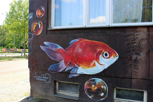 The fish are on the corner of Altenburgerstrasse and Richard-Lehmannstrasse. We saw them while heading towards the Asisi Panometer. (You can’t see them on Streetview- it’s from 2008!)