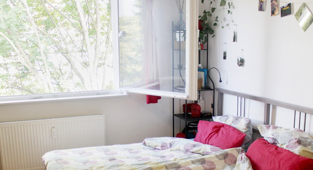 The dominant ‘feature’ of the room, apart from the bed, is a massive window. Outside, we have a giant oak tree, that casts the room in a soft green light (and makes it impossible to take balanced photos, especially when the sky is grey and shiny- sorry about that guys!)