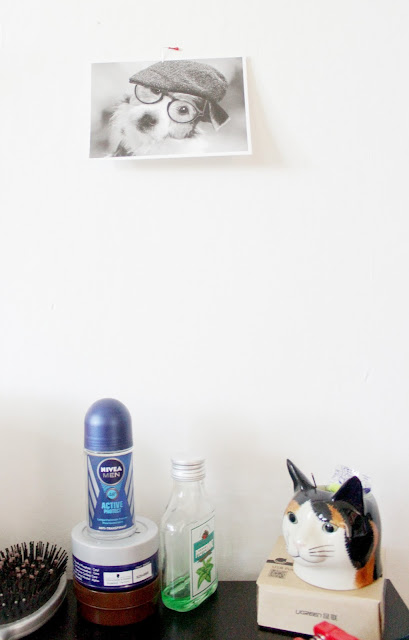 Andy’s side of the bed is all about the bookshelf. Plus this picture of a dog, which for some reason he fell in love with, (only to be super disappointed afterwards when he found out the glasses and hat were photoshopped on).